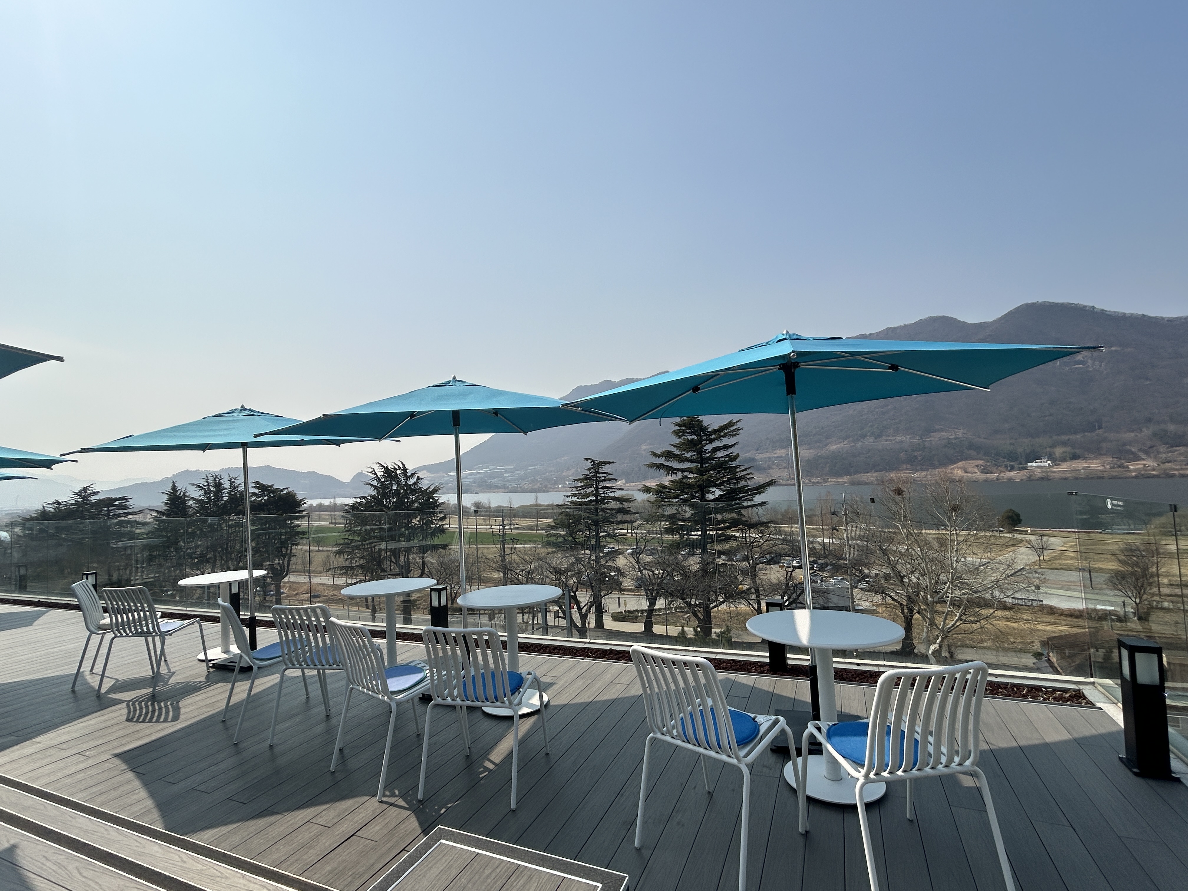 루프탑 야외 데크에는 파란 파라솔이 쭉 늘어서 있는데, 하늘이랑 산이랑 색감이 딱 맞아서 사진 찍으면 그냥 다 작품이에요 📸 날씨 좋은 날 야외석에 앉으면 진짜 해외 어딘가에 온 것 같은 기분 납니다.