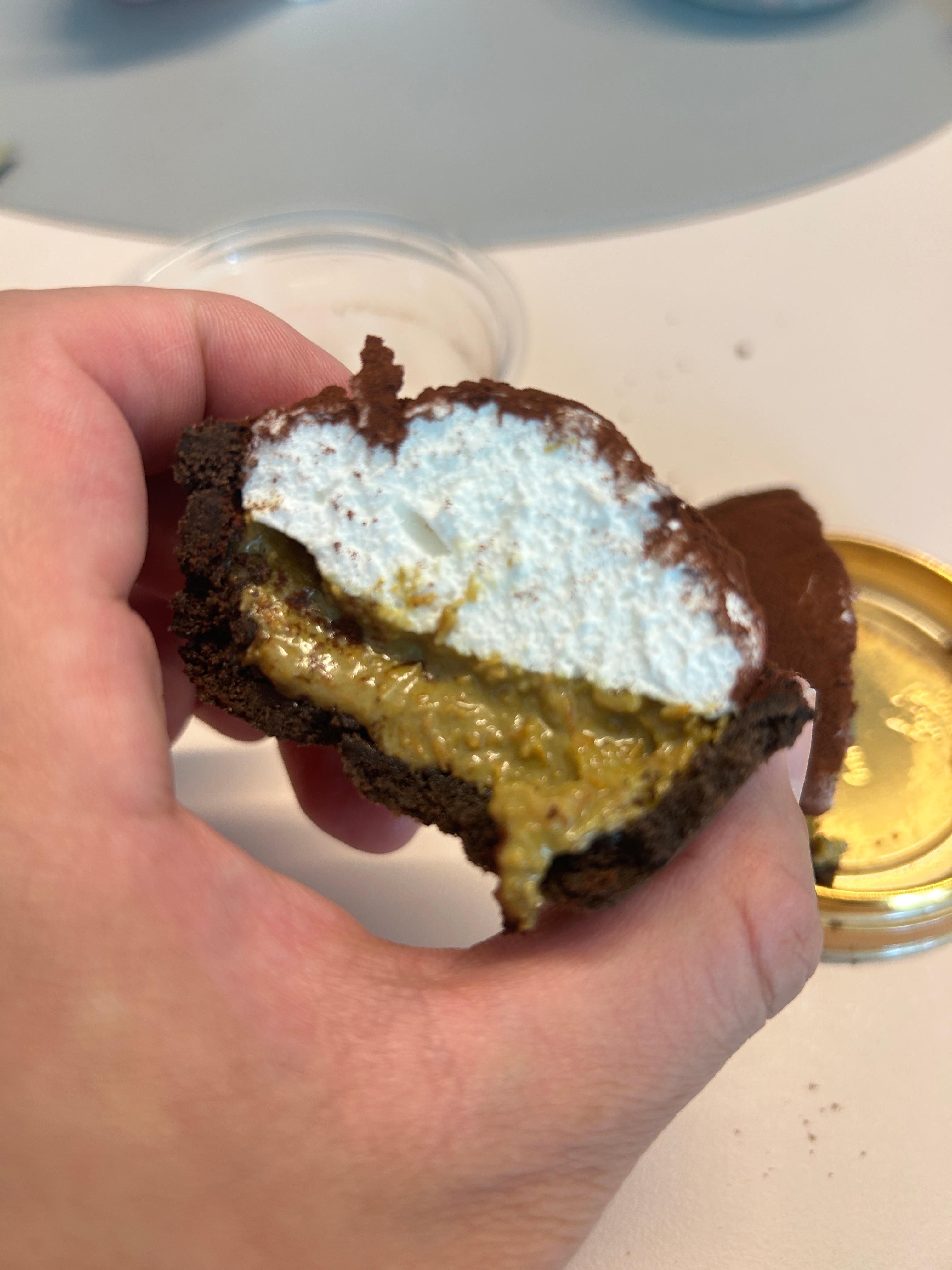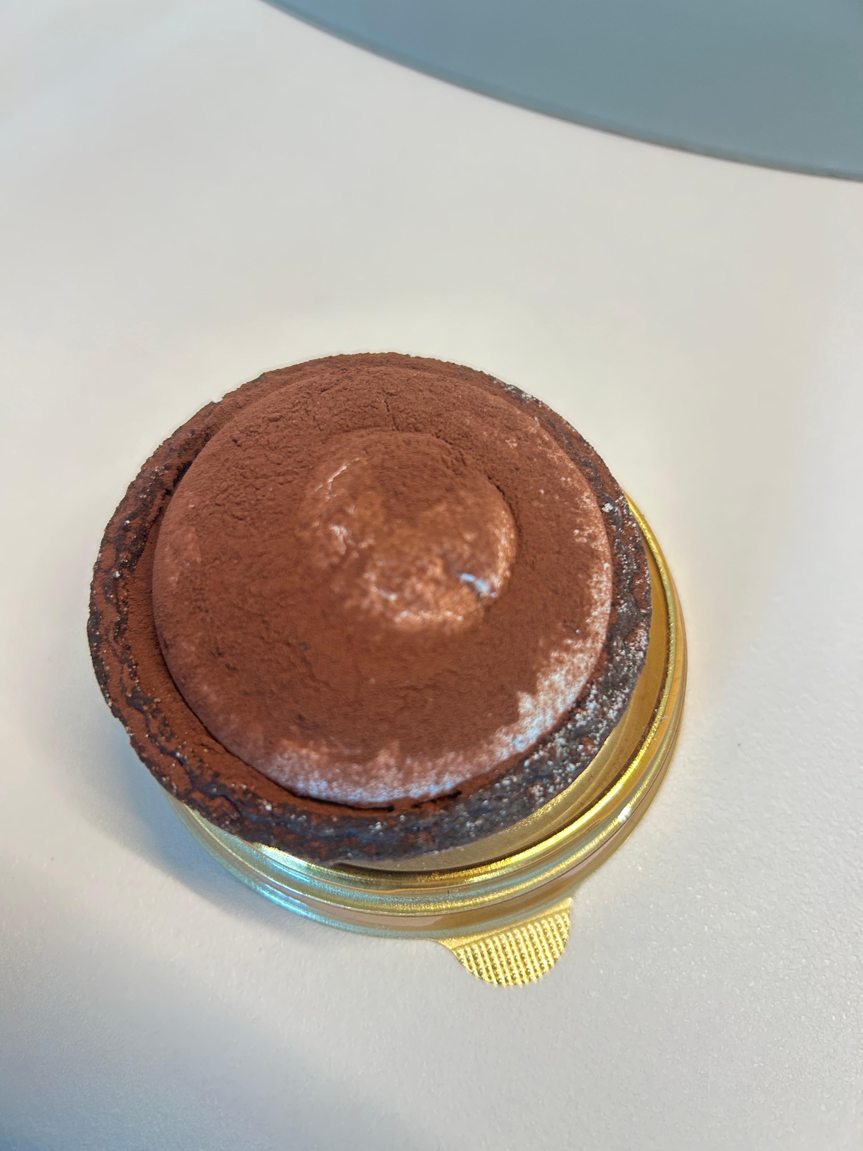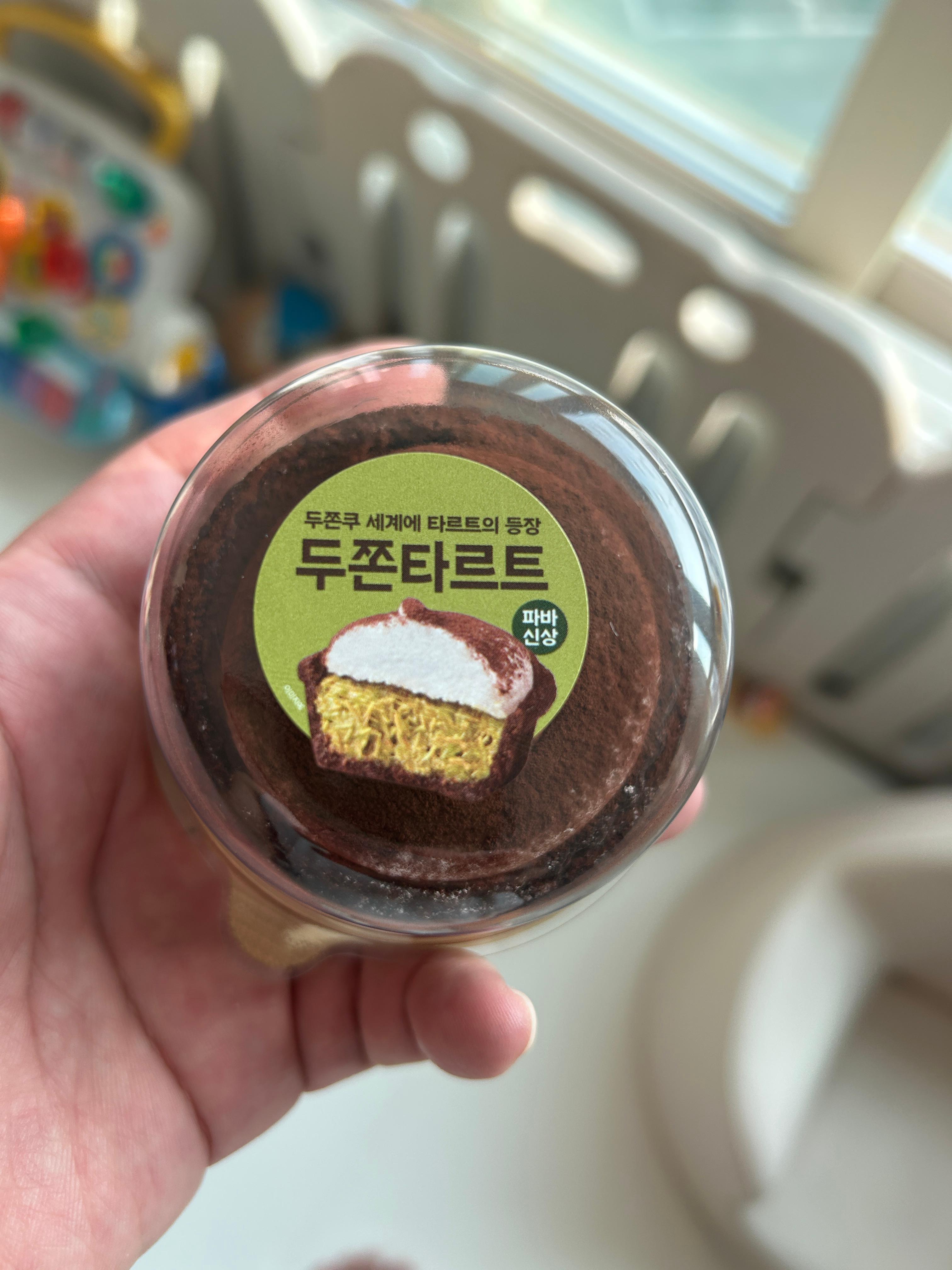 뚜껑을 열면 코코아 파우더가 듬뿍 뿌려진 둥글고 묵직한 타르트가 등장해요. 두쫀쿠가 쿠키 베이스였다면, 두쫀타르트는 이름 그대로 초코쿠키 타르트 쉘을 베이스로 합니다. 손에 쥐었을 때 묵직한 밀도가 느껴지고, 비주얼 자체가 꽤 고급스러워 보여요.